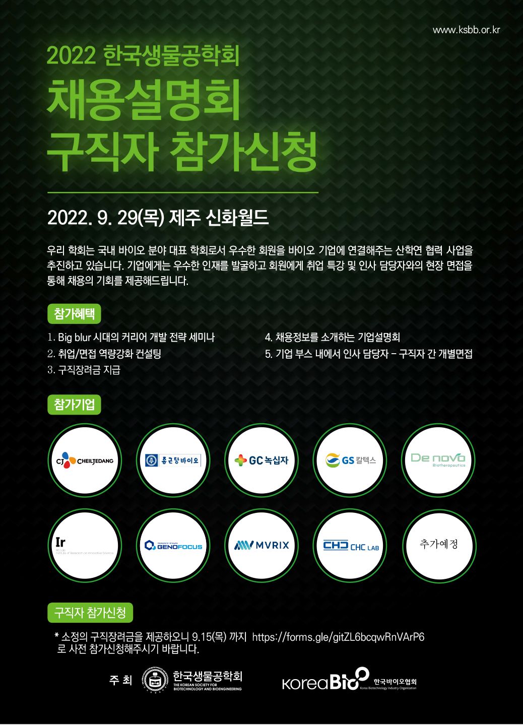 교육 · 행사 목록 조회수:2110 설명회 2022년 한국생물공학회 채용설명회 구직자 참가신청 분야바이오의약,바이오화학 교육기간2022.09.29 ~ 09.29 모집기간2022.09.29 ~ 09.29 장소제주 신화월드 주최/주관한국생물공학회 / 한국바이오협회 모집인원제한없음 참가비용무료 URLhttps://forms.gle/gitZL6bcqwRnVArP6 문의 / ※ 이미지 클릭시 참가신청페이지로 이동합니다참가신청 페이지 : https://forms.gle/gitZL6bcqwRnVArP6 목록