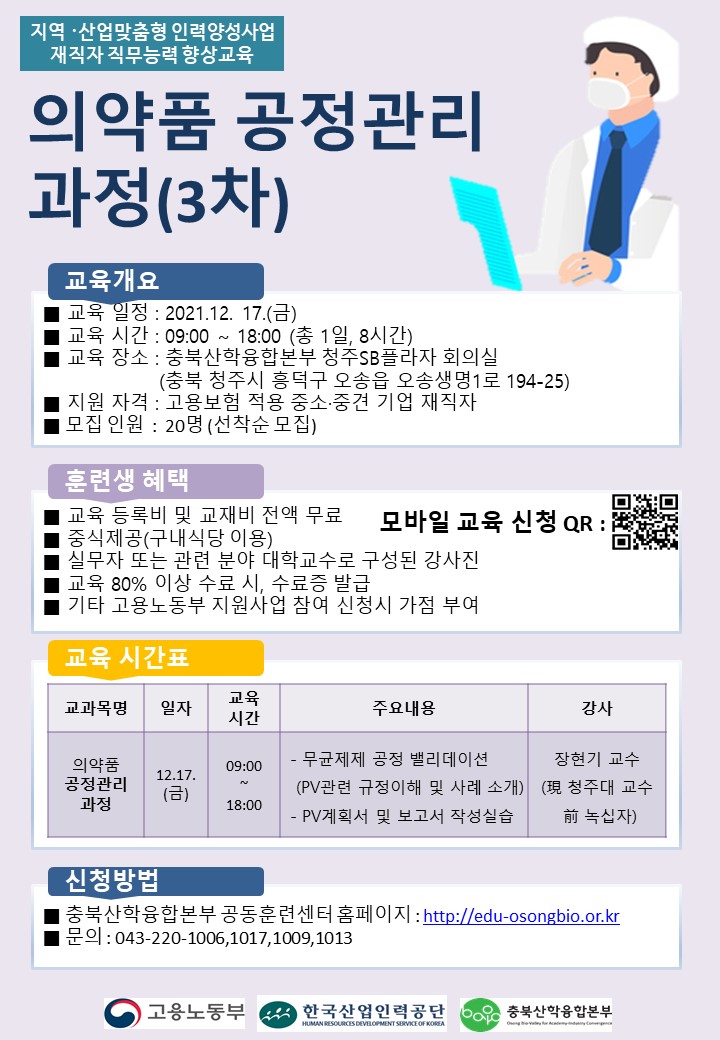 교육 · 행사 목록 조회수:3432 교육/강의 [재직자 무료교육] 12월 의약품 공정관리 과정 교육생 모집 분야고무 교육기간2021.11.25 ~ 12.14 모집기간 ~ 장소충북 청주시 흥덕구 오송읍 오송생명1로 194-25 주최/주관사단법인 충북산학융합본부 모집인원선착순 20명 참가비용무료 URLhttp://www.edu-osongbio.or.kr/ 문의043-220-1006 / glay1432@cbio.or.kr 목록