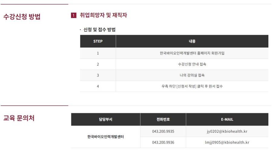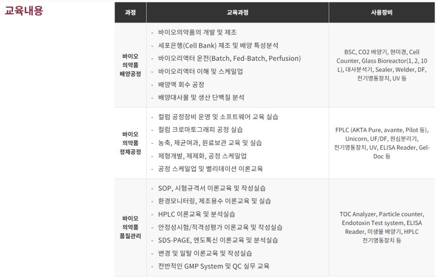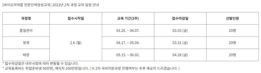 교육 · 행사 목록 조회수:1845 교육/강의 [바이오의약품 전문인력양성교육] 2023년 2차 과정 교육 일정 안내 분야바이오의약 교육기간2023.03.20 ~ 06.02 모집기간2023.02.03 ~ 04.28 장소 주최/주관한국바이오인력개발센터 모집인원신청자 중20명 참가비용유료(500,000원) URLhttps://bioexpert.kbiohealth.kr/fro_end/html/dep_04/4100.php?pagetype=&rownum=1&bbs_idx=773&pageno=1&pagekind=c&bbsid=notice&cafeid=&ref_code=&keyword=&keyfield=&category=&qstr=&gopage=/fro_end/html/dep_04/4100.php? 문의 / 한국바이오인력개발센터에서 [바이오의약품 전문인력양성교육] 2023년 2차 과정을 개설하였습니다. 자세한 내용 및 교육 신청은 한국바이오개발센터 홈페이지(https://bioexpert.kbiohealth.kr/fro_end/html/main/)에서 확인 바랍니다. 목록
