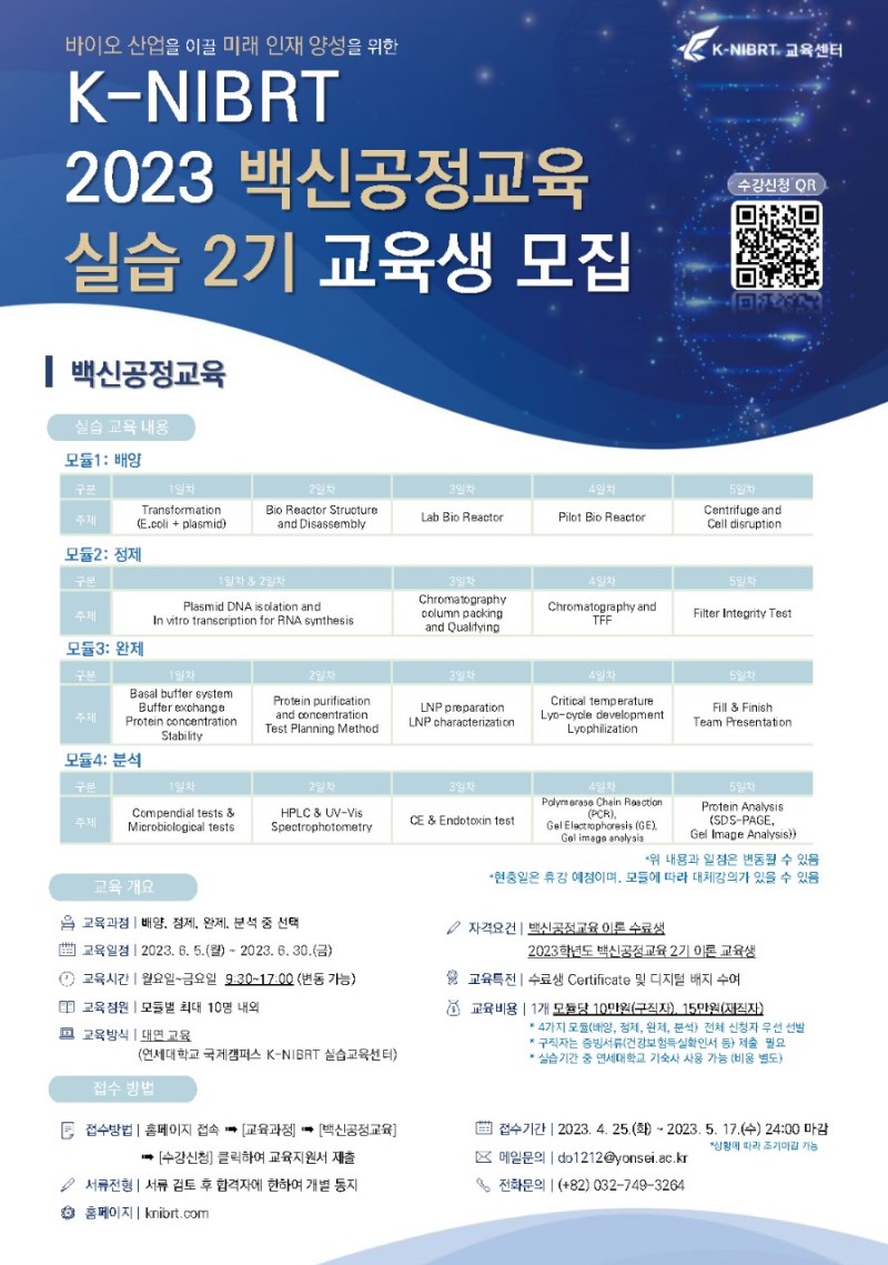 교육 · 행사 목록 조회수:1832 교육/강의 [K-NIBRT] 2023 백신공정교육 실습 2기 교육생 모집 분야바이오의약 교육기간2023.06.05 ~ 06.30 모집기간2023.04.25 ~ 05.17 장소 주최/주관K-NIBRT 사업단 바이오공정인력양성센터 모집인원제한없음 참가비용유료(원) URLhttp://knibrt.com/education/n_02_1_view.php?num=574&page=1&cate_1=338&cate_2=&lecture_type=1&make=&search=&lecture_level= 문의 / 목록