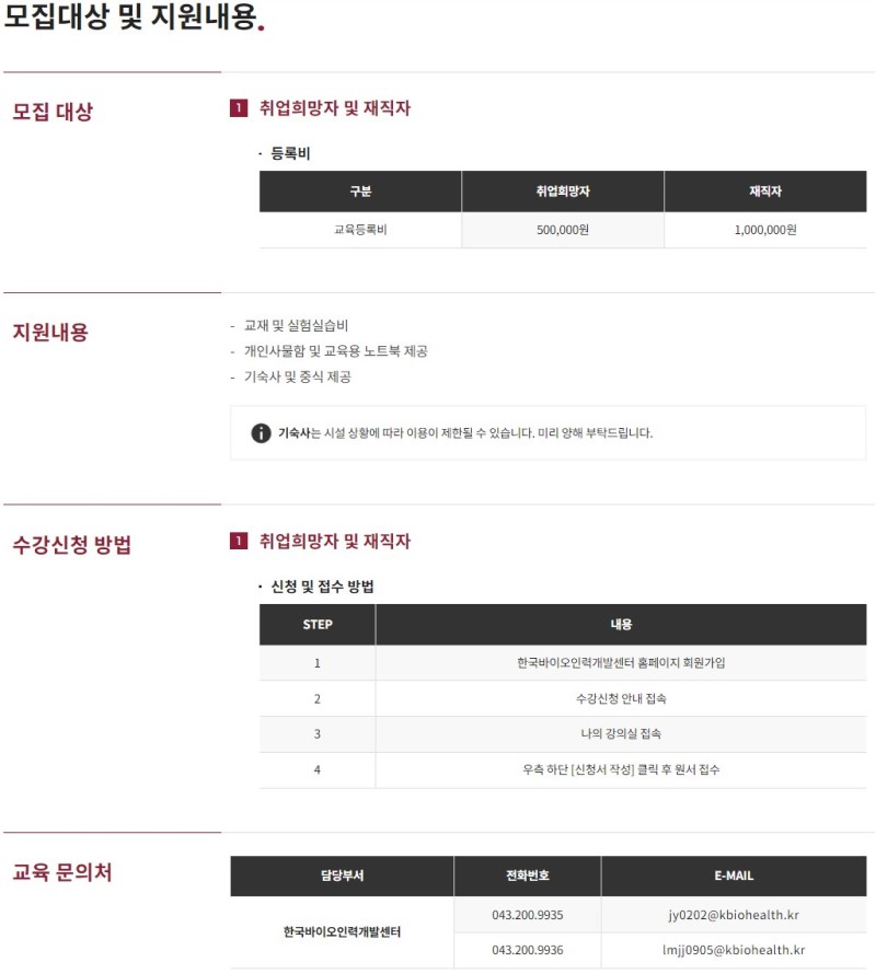 자세한 내용 및 교육 신청은 한국바이오개발센터 홈페이지(https://bioexpert.kbiohealth.kr/fro_end/html/main/)에서 확인 바랍니다.