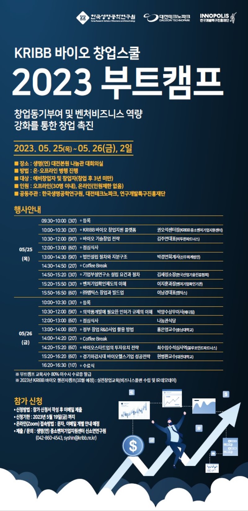 생명(연)은 바이오 예비창업자 및 초기창업자의 벤처비즈니스 역량강화를 위하여 [2023 KRIBB 바이오 창업스쿨(부트캠프)]를 개최하고자 합니다. |
