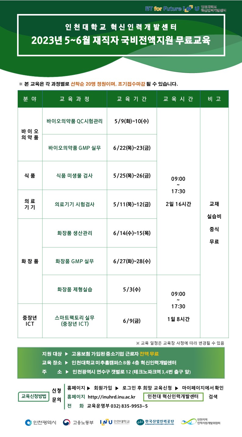 교육 · 행사 목록 조회수:2378 교육/강의 2023년 5~6월 재직자 국비전액지원 무료교육 분야바이오의약,화장품 교육기간2023.05.03 ~ 06.28 모집기간2023.05.03 ~ 06.28 장소 주최/주관인천대학교 혁신인력개발센터 모집인원선착순 20명 참가비용무료 URLhttps://inuhrd.inu.ac.kr/resider0/resider_info.asp? 문의032-835-9953~5 / 목록