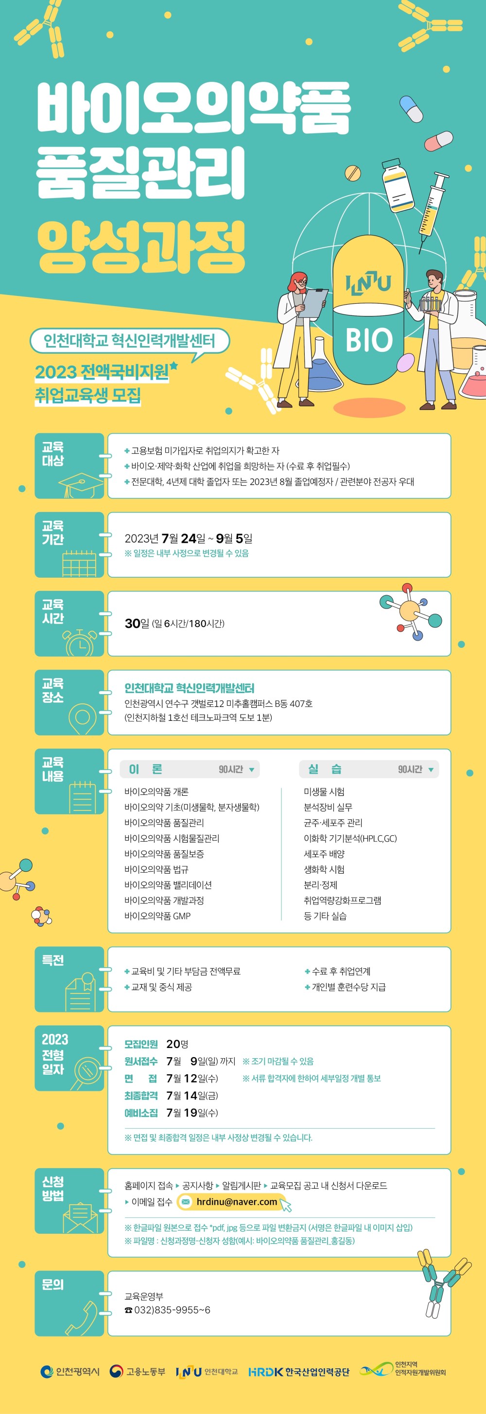 교육 · 행사 목록 조회수:1744 교육/강의 바이오의약품 품질관리 양성과정 훈련생 모집 분야바이오의약 교육기간2023.07.24 ~ 09.05 모집기간2023.06.13 ~ 07.09 장소 주최/주관인천대학교 혁신인력개발센터 모집인원신청자 중20명 참가비용무료 URLhttps://inuhrd.inu.ac.kr/notice0/notice.asp?bidx=828&bgbn=R 문의032-835-9955 / hrdinu@naver.com 목록