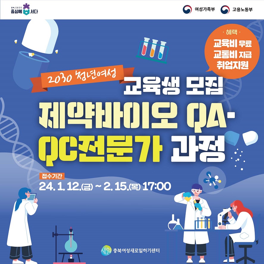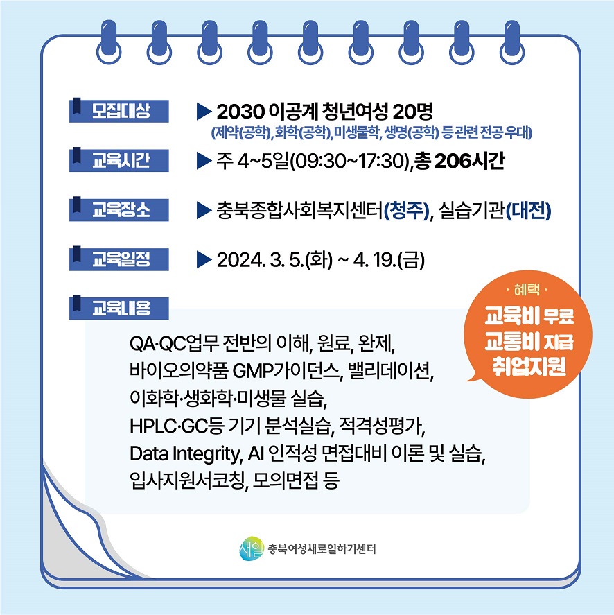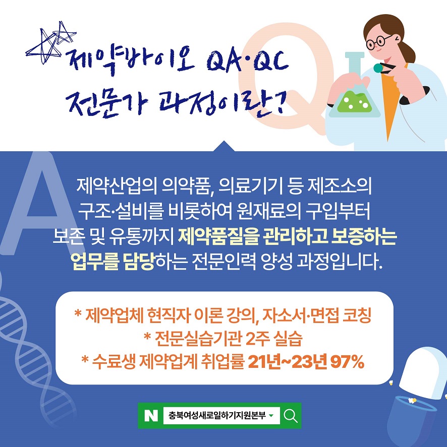 본 과정은 여성가족부의 위탁을 받아 국비 무료로 진행하는 제약바이오 업계 품질분야(QA.QC)