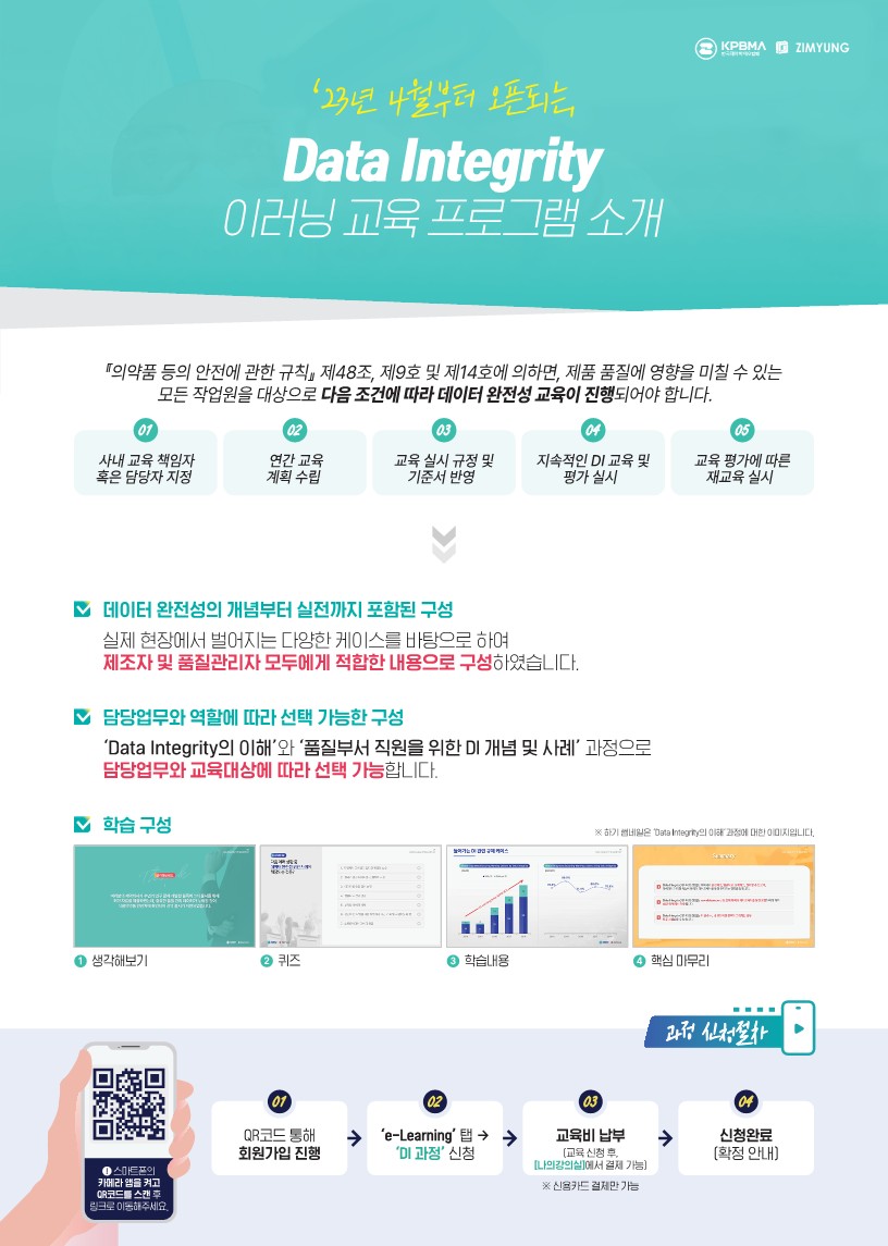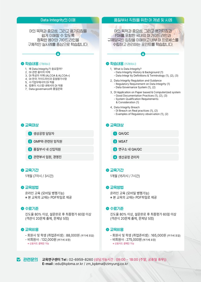교육 · 행사 목록 조회수:737 교육/강의 [기초] Data Integrity의 이해 분야의약 교육기간2024.01.01 ~ 12.15 모집기간2024.01.01 ~ 12.15 장소e-Learning 주최/주관한국제약바이오협회 모집인원제한없음 참가비용유료(회원사 및 취업준비생 : 8.8만원) URLhttps://edu.kpbma.or.kr/elearning/di/eduplan/view/6780 문의02-6959-8260 / zm_kpbma@zimyung.co.kr [Data Integrity의 이해]■ 교육대상 : 제약업체 및 타업종 재직자 (학생 포함)■ 교육기간 : 1개월 (7차시 / 3시간)■ 교육방법 : 온라인 교육 (모바일 병행가능) - 교육 요약본 PDF 파일로 제공■ 수료기준 : 진도율 80%이상, 최종평가 60점 이상(객관식 20문제 출제, 문제 당 5점)■ 교육비용(부가세 포함) : - 회원사 및 학생(취업준비생) 88,000원 - 비회원사 132,000원■ 결제방법 : 신용카드■ 학습구성 목록