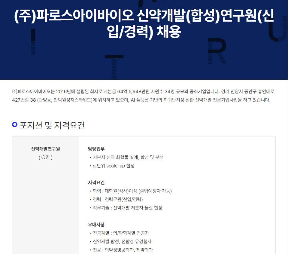 구인정보 (주)파로스아이바이오 신약개발(합성)연구원(신입/경력) 채용 0 (주)파로스아이바이오 기업구분 기업 사원수 0 명 설립일 0년 0월 주요사업 서울 > 구로구 홈페이지 https://www.pharosibio.com/ 주소 경기 안양시 동안구 흥안대로427번길 38인덕원성지스타위드 1408호드 1408호(관양동, 인덕원성지스타위드)(14059) 기업·기관 소개 채용정보 모집부문 의약품 합성연구 주요업무 신약개발 저분자 물질 합성 근무시간 주 5일(월~금, 09:00~18:00) 근무형태 정규직 경력 경력무관 연령 제한없음 학력 대학원(석사)이상↑ 모집인원 0 명 급여 회사내규에 따름 성별 무관 근무지역 서울 > 구로구 복리후생 건강보험 , 고용보험 , 국민연금 , 산재보험 , 주5일근무 , 연차/월차 , 퇴직금 , 경조휴가, 육아휴직, 창립기념일 행사, 스톡옵션, 경조금, 중식 석식 지원, 휴양시설 상세요강 접수기간 및 방법 접수기간 상시채용 담당자 (주)파로스아이바이오 전화 02-6348-6175 Email hr@pharosibio.com 접수방법 CHEM-BIO 접수 / 홈페이지접수 목록 입사지원