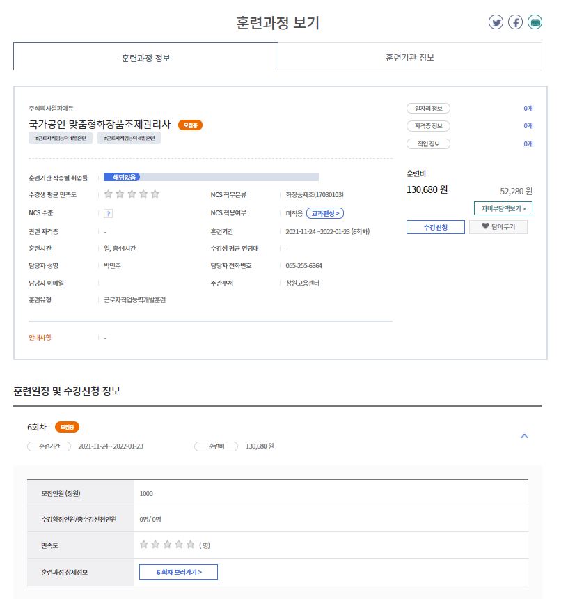 교육 · 행사 목록 조회수:3156 교육/강의 국가공인 맞춤형화장품조제관리사 분야 교육기간2021.11.24 ~ 01.23 모집기간 ~ 장소 주최/주관주식회사 알파에듀 모집인원선착순 1000명 참가비용기타 URLhttps://www.hrd.go.kr/hrdp/co/pcobo/PCOBO0100P.do?tracseId=ACG20213000755912&tracseTme=6&crseTracseSe=C0031&trainstCstmrId=500020026325#undefined 문의055-255-6364 / 목록
