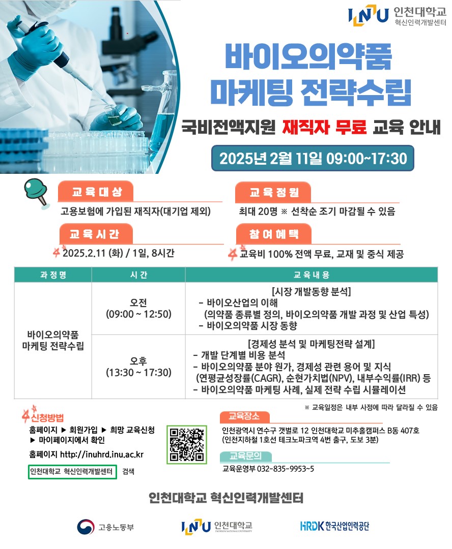 교육 · 행사 목록 조회수:406 교육/강의 바이오의약품 마케팅 전략수립 분야바이오의약 교육기간2025.02.11 ~ 02.11 모집기간2025.01.17 ~ 02.10 장소인천광역시 연수구 갯벌로 12 인천대학교 미추홀캠퍼스 B동 407호 주최/주관인천대학교 혁신인력개발센터 모집인원선착순 20명 참가비용무료 URLhttps://inuhrd.inu.ac.kr/resider0/bio_apply.asp?idx=579&bgbn=R 문의032-835-9953~5 / borisinu@inu.ac.kr 목록