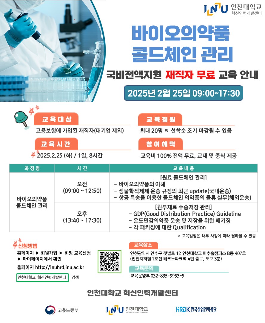 교육 · 행사 목록 조회수:454 교육/강의 바이오의약품 콜드체인 관리 분야바이오의약 교육기간2025.02.25 ~ 02.25 모집기간2025.01.17 ~ 02.24 장소인천광역시 연수구 갯벌로 12 인천대학교 미추홀캠퍼스 B동 407호 주최/주관인천대학교 혁신인력개발센터 모집인원선착순 20명 참가비용무료 URLhttps://inuhrd.inu.ac.kr/resider0/bio_apply.asp?idx=580&bgbn=R 문의032-835-9953~5 / borisinu@inu.ac.kr 목록