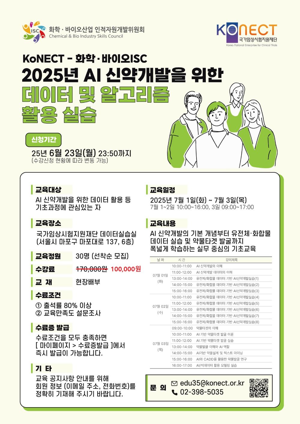 교육 · 행사 목록 조회수:296 교육/강의 AI 신약개발을 위한 데이터 및 알고리즘 활용 실습 분야의약,바이오의약 교육기간2025.07.01 ~ 07.03 모집기간2025.06.02 ~ 06.23 장소국가임상시험지원재단(서울 마포구) 주최/주관화학바이오ISC & 국가임상시험지원재단 모집인원선착순 30명 참가비용유료(100000원) URLhttps://lms.konect.or.kr/web/course/courseView.do?eduCd=K000000001202505270003&eduCertifiedYn=N&category1=109 문의02-540-7152 / hsh@chem-bio.net 목록