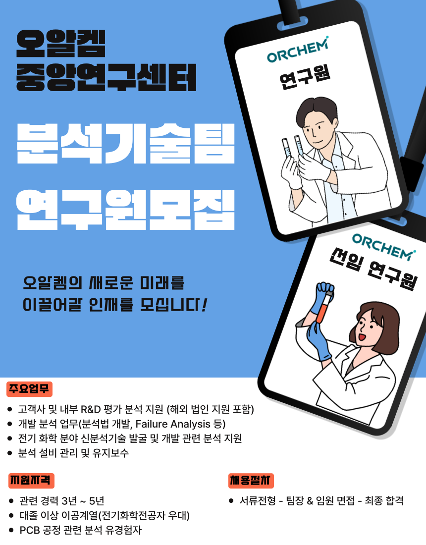 구인정보 중앙연구센터 분석기술팀 선임연구원 채용 (3~5년) 0 오알켐 기업구분 기업 사원수 157 명 설립일 1991년 7월 주요사업 경기 > 안산시 단원구 홈페이지 주소 경기 안산시 단원구 시화벤처로 705오알켐(성곡동, (주)오알켐)(15657) 기업·기관 소개 PCB 약품 채용정보 모집부문 정밀화학 분석 실험 주요업무 고객사 및 내부 R&D 평가 분석 지원 (해외 법인 지원 포함) 개발 분석 업무(분석법 개발, Failure Analysis 근무시간 근무형태 정규직 경력 경력 3 년 이상 연령 제한없음 학력 대학교(4년)이상↑ 모집인원 0 명 급여 회사내규에 따름 성별 무관 근무지역 경기 > 안산시 단원구 복리후생 건강보험 , 고용보험 , 국민연금 , 산재보험 , 주5일근무 , 연차/월차 , 퇴직금 , 의료/건강지원 , https://bepartoforchem.career.greetinghr.com/ko/culture1 상세요강 접수기간 및 방법 접수기간 채용시까지 담당자 김채연 전화 -- Email hichaen1101@orchem.com 접수방법 목록 입사지원
